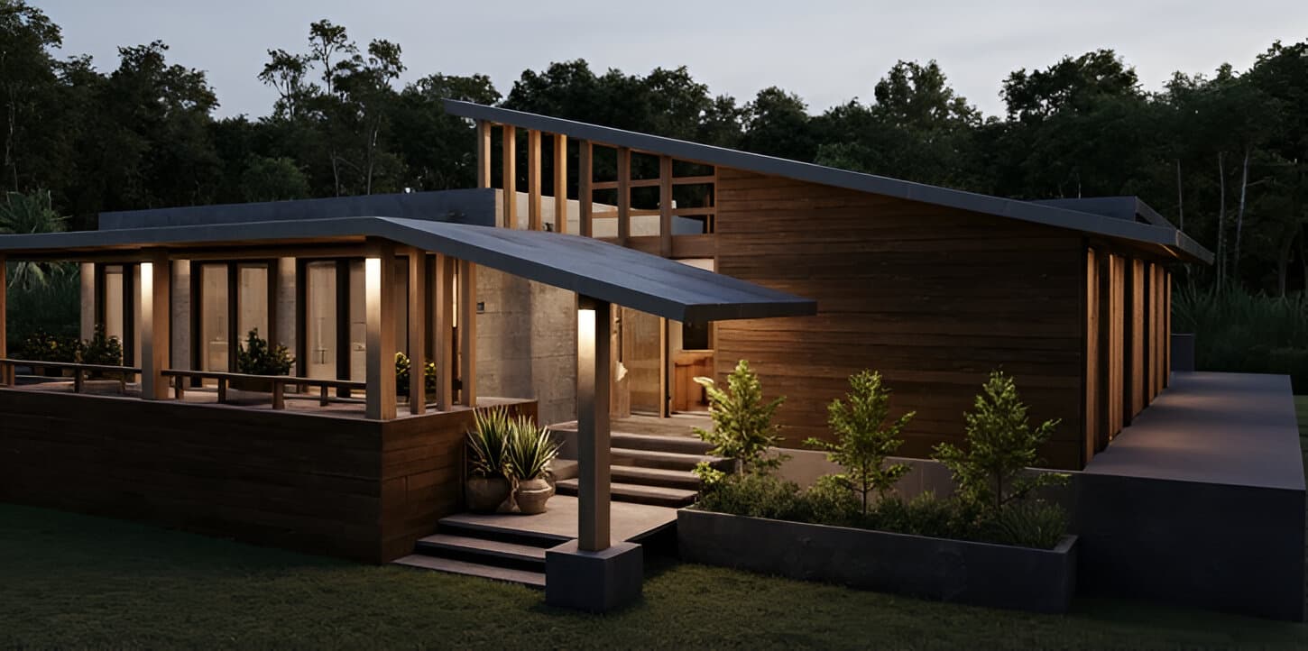 El proyecto se distingue por un acceso jerarquizado, mediante la acentuación de la línea de cubierta. Las inclinaciones pronunciadas de la cubierta, no solo otorgan una identidad arquitectónica singular al ingreso, sino que también actúan como dispositivos pasivos fundamentales para la gestión eficiente de la ventilación cruzada. Además, en consideración empática hacia la intimidad y el bienestar de los espacios privados, se ha dispuesto un balcón perimetral que los circunda estratégicamente. El balcón actúa como una zona de transición amable entre el interior doméstico y el exterior, ofreciendo un espacio intermedio que permite disfrutar del entorno natural con un grado de privacidad superior. A su vez, este elemento contribuye a la calidad espacial interior al proporcionar iluminación natural indirecta y vistas filtradas del paisaje, enriqueciendo la experiencia sensorial del habitante y fomentando una conexión más pausada y controlada con el mundo exterior.